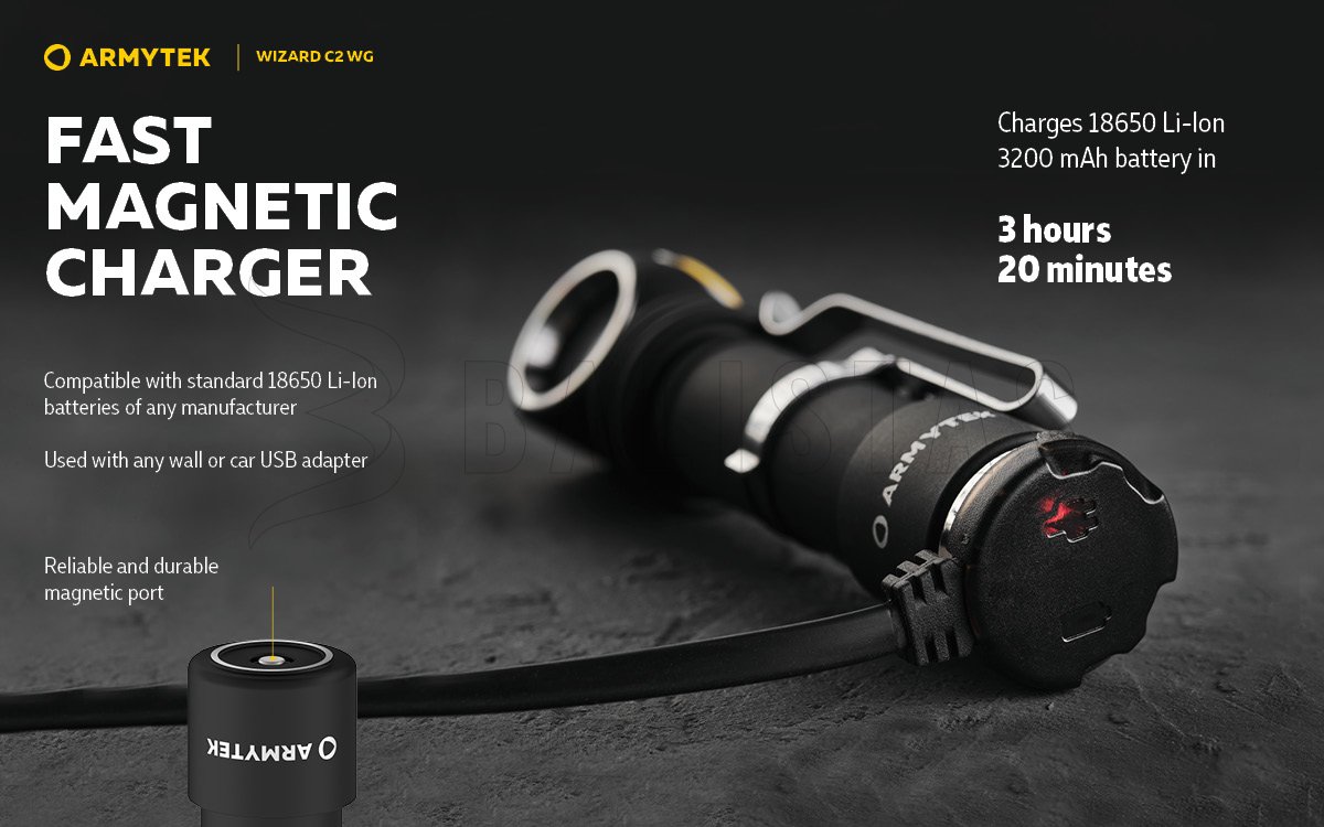 La linterna funciona con una sola batería 18650 Li-ion, con la que puede brillar durante 2h30min en el modo más alto (2h20min en el modo verde más alto) y hasta 65 días en el modo más bajo (50 días en el modo verde más bajo). Con la ayuda del cargador magnético, la linterna se carga en sólo 3h20min.